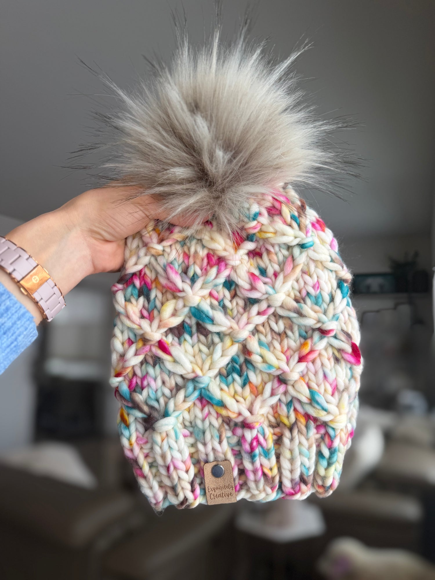 • Luxury Large Faux Fur Pom Pom (attached by a cord and a pom pom button.)